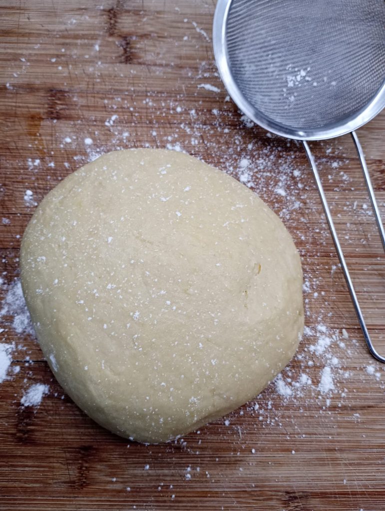 Kneten, solange es in der Schüssel möglich ist, dann den Teig auf einer bemehlten Fläche weiterarbeiten, bis ein Teigball entsteht. Um den Teigball zu festigen, kann es notwendig sein, weiteres Mehl hinzuzufügen.