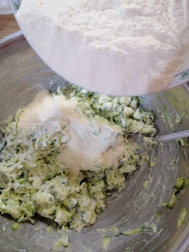 Nach 5 Minuten die Zucchini gut auspressen und in eine Schüssel geben, Salz und Ricotta hinzufügen