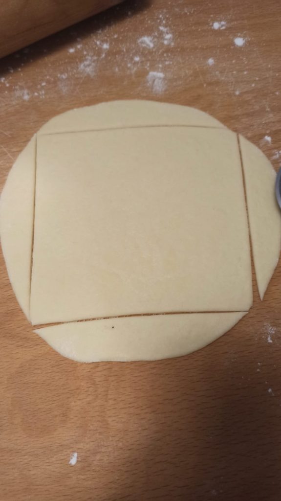 Nehmen Sie eine Kugel, rollen Sie sie mit dem Nudelholz zu einem Kreis aus. Schneiden Sie die Ränder zu einem Quadrat aus.