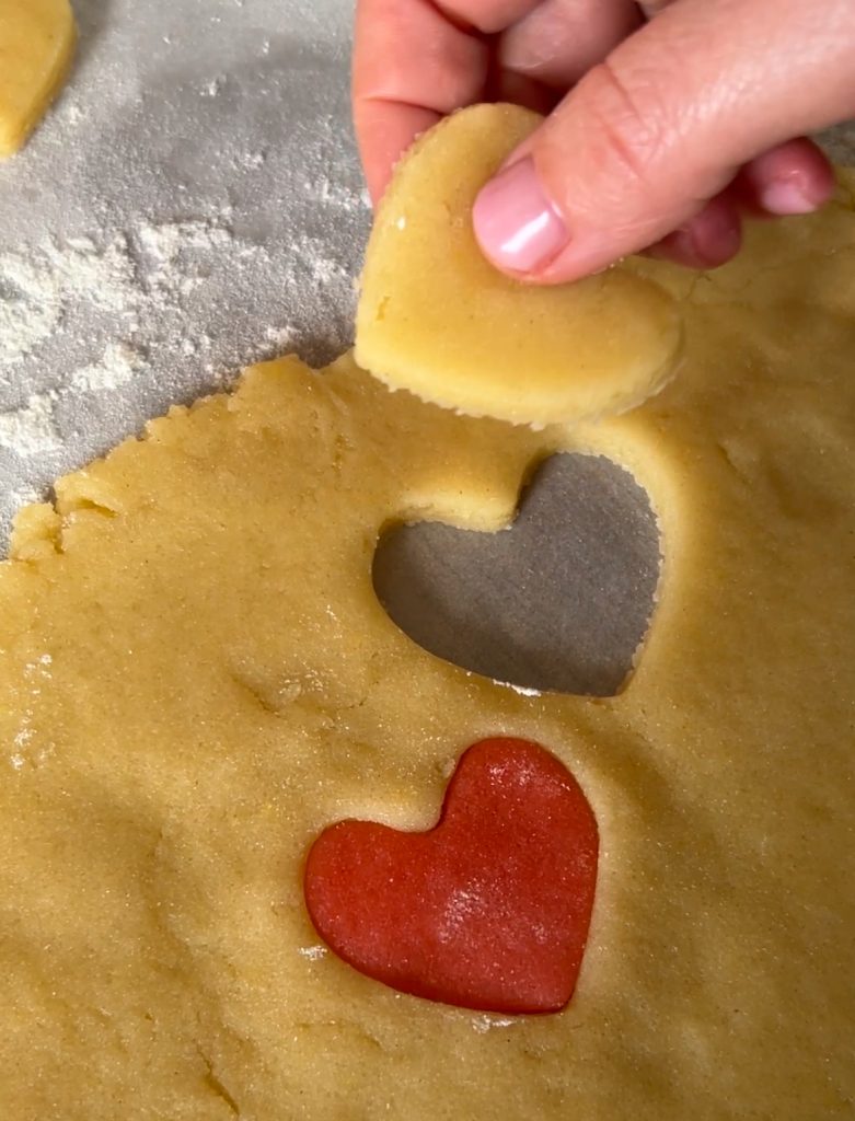 Die Kekse mit einem etwas größeren herzförmigen Ausstecher ausschneiden.