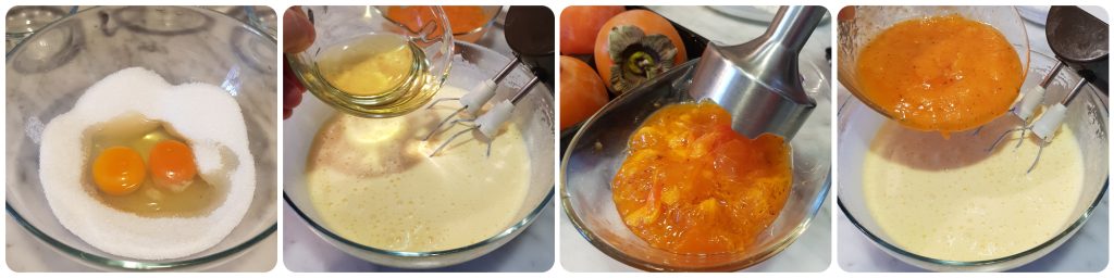 Den Ofen auf 175 Grad vorheizen. Eier und Zucker in eine Schüssel geben und mit dem elektrischen Handrührer schlagen, bis die Masse schaumig ist. Öl und gewaschene, geschälte und pürierte Kakis hinzugeben. Bei niedriger Geschwindigkeit weiter mit dem elektrischen Handrührer verrühren.
