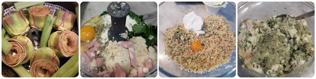 Nach der Reinigung die Artischocken auf den Einsatz des Schnellkochtopfs setzen und ab dem ersten Zischen 8 Minuten dämpfen. In der Zwischenzeit die Füllung vorbereiten, indem man die Semmelbrösel, die Petersilie, den Thymian, den Knoblauch ohne Keim, die Mortadella, den Parmesan und das Salz im Mixer zerkleinert. Die Mischung in eine Schüssel geben, den Ricotta, das Ei, die gehackten Stiele hinzufügen und vermengen.