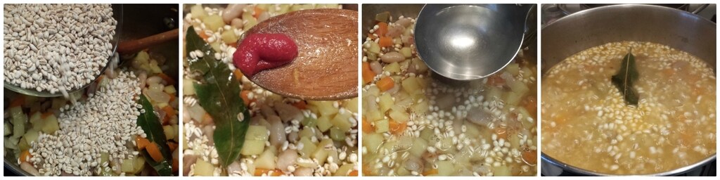 Die Gerste, das Tomatenmark hinzufügen und mit dem kochenden Wasser bedecken. Rühren und etwa eine Stunde lang bei niedriger Hitze köcheln lassen. Die Gersten- und Cannellini-Bohnensuppe auf Teller verteilen und mit einem Schuss Öl und einigen Löffeln Parmigiano würzen. Um das Gericht abzurunden, bereiten Sie einige Scheiben Bauernbrot vor, die in der Pfanne mit einem Schuss Öl, Rosmarin, Salz und einer Knoblauchzehe geröstet wurden.