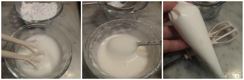 Das Eiweiß in eine kleine Schüssel geben und fast steif schlagen. Den Zitronensaft und den gesiebten Puderzucker hinzufügen, damit keine Klumpen entstehen. Rühren, bis eine homogene Creme entsteht. Den Zuckerguss in eine Tülle oder einen Spritzbeutel geben.