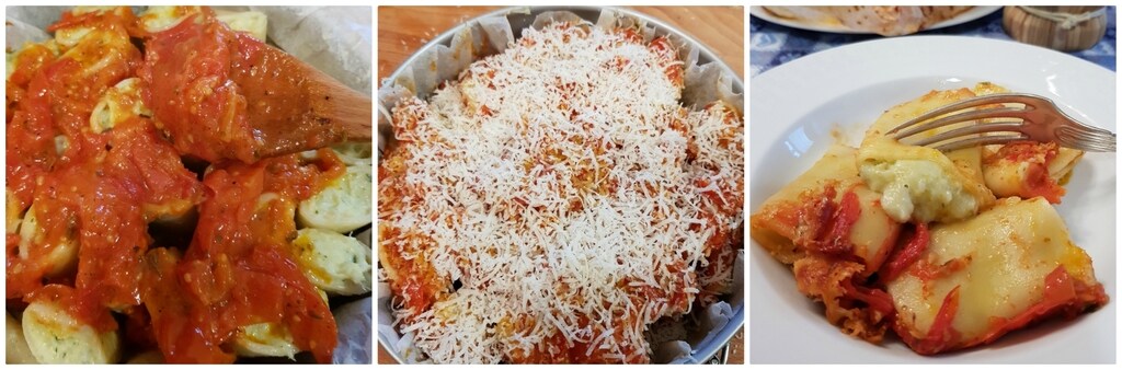Werfen Sie die Paccheri in kochendes Salzwasser und lassen Sie sie 10 Minuten kochen. Abgießen, in kaltem Wasser abschrecken und dann auf einem sauberen Küchentuch trocknen lassen. Bereiten Sie die 24 cm Springform mit Backpapier vor (gefeuchtet und ausgewrungen). Die Füllung in einen Spritzbeutel geben und die Paccheri einzeln füllen, sie aufrecht in die Form stellen. Den Ofen auf 220 Grad im statischen Modus vorheizen.