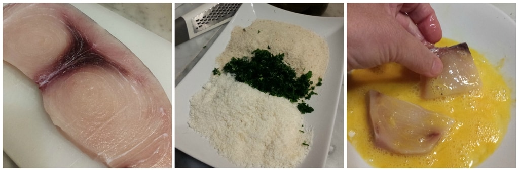 Die Schwertfischscheiben in kleine Stücke wie Bissen schneiden und die Haut entfernen. Separat die Panade vorbereiten, indem man den Parmesan, das Paniermehl, die Petersilie und den gehackten Knoblauch mischt. Das Ei in einem Teller aufschlagen und mit einer Gabel verquirlen, dann die Fischstücke von beiden Seiten darin wenden.