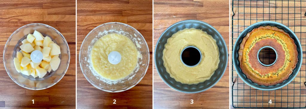 Ein leckerer Apfelkuchen, weich und vor allem sehr einfach zuzubereiten… Apfelbrot-Kuchen, mit pürierten Äpfeln, bereitet sich schnell zu, ist weich, duftend und genau richtig feucht. Für den Teig können Sie entweder flüssige Butter wie ich verwenden oder Pflanzenöl, und wenn Sie Bio-Äpfel zur Verfügung haben, können Sie die Schale dranlassen, damit der Kuchen noch besser wird. In diesem Fall habe ich eine hohe und schmale Kranzform gewählt, aber Sie können den Kuchen in jeder Form backen. Probieren Sie den Apfelbrot-Kuchen, er ist perfekt zu jeder Tageszeit!