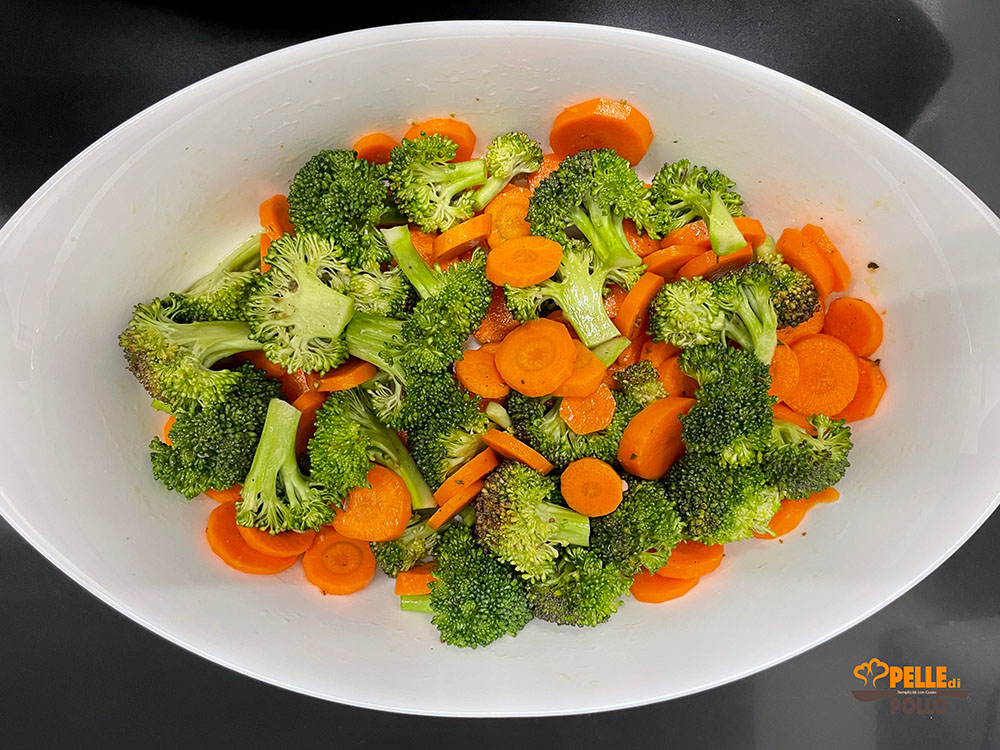 • Geben Sie Brokkoli und Möhren in eine Auflaufform, würzen Sie mit extra nativem Olivenöl, Salz und einem Spritzer Zitronensaft.