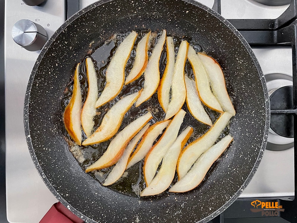 Schmelzt ein kleines Stück Butter in einer Pfanne, fügt die Birnen hinzu und bratet sie für ein paar Minuten an, wobei ihr sie ein- oder zweimal wendet. Sie sollten dennoch intakt und fest bleiben.