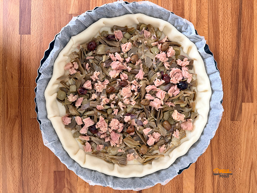 Verteilt die Artischocken, den Thunfisch und die Taggiasca-Oliven. Stellt die Tarte in einen vorgeheizten Umluftofen bei 180–190°C und backt sie etwa 20 Minuten.
