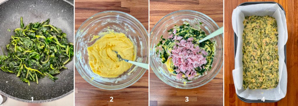 • Schneiden Sie den gekochten Schinken in kleine Würfel oder Streifen, fügen Sie ihn zur Mischung hinzu und geben Sie auch den zuvor gekochten Mangold hinzu (3).