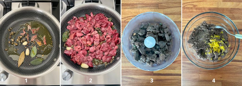 Übertragen Sie das Pâté in eine Schüssel, fügen Sie eine Prise Pfeffer und die geriebene Schale von etwa einer halben Zitrone hinzu (4).