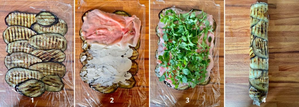 Kalter Auberginenroll, ein einfaches, schnelles und leichtes Rezept, perfekt für den Sommer! Eine ganz einfache Basis aus gegrillten Auberginen, die Sie mit Zutaten Ihrer Wahl füllen können. In meinem Fall habe ich Frischkäse, gekochten Schinken und Rucola gewählt… aber Sie können nach Belieben variieren; am Ende der Zubereitung finden Sie einige Vorschläge. Der gegrillte Auberginenroll ist hervorragend als Vorspeise, kann aber auch als Hauptgericht in größeren Portionen serviert werden. Um gleichmäßige Scheiben zu schneiden, die sich nicht öffnen, lassen Sie den Roll mindestens eine Stunde im Kühlschrank ruhen, damit er sich gut verfestigt. Probieren Sie das Rezept, denn es ist wirklich lecker!