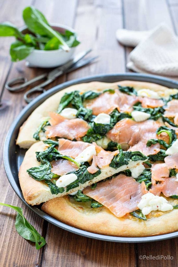 Die Pizza mit geräuchertem Lachs, Kräutern und Stracchino ist bereit… guten Appetit!