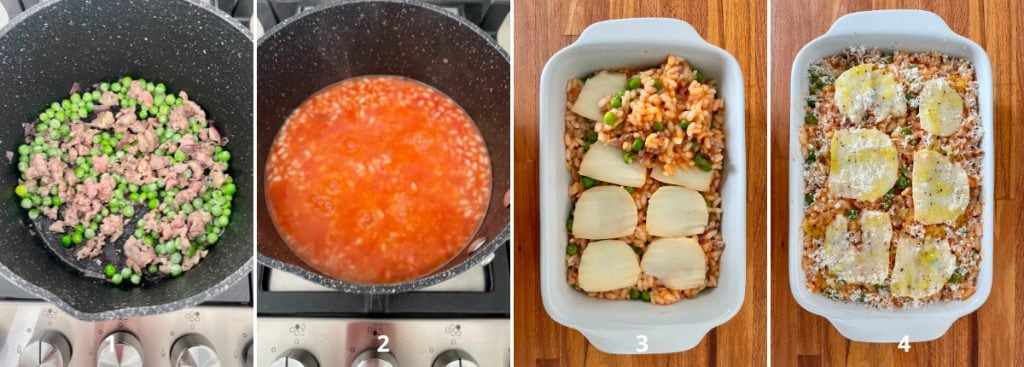 Der Reisauflauf mit Erbsen und Wurst ist fertig, serviert ihn heiß und schmelzig… guten Appetit!
