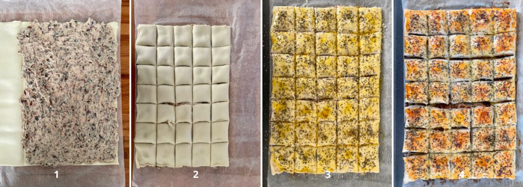 Legt die andere Hälfte darüber und drückt leicht an. Schneidet mit dem Teigrad Quadrate gleicher Größe, ohne sie zu trennen (2), damit sie beim Backen nicht „aufgehen“. Ich habe 35 gemacht, aber ihr könnt sie auch etwas größer oder rechteckig machen.