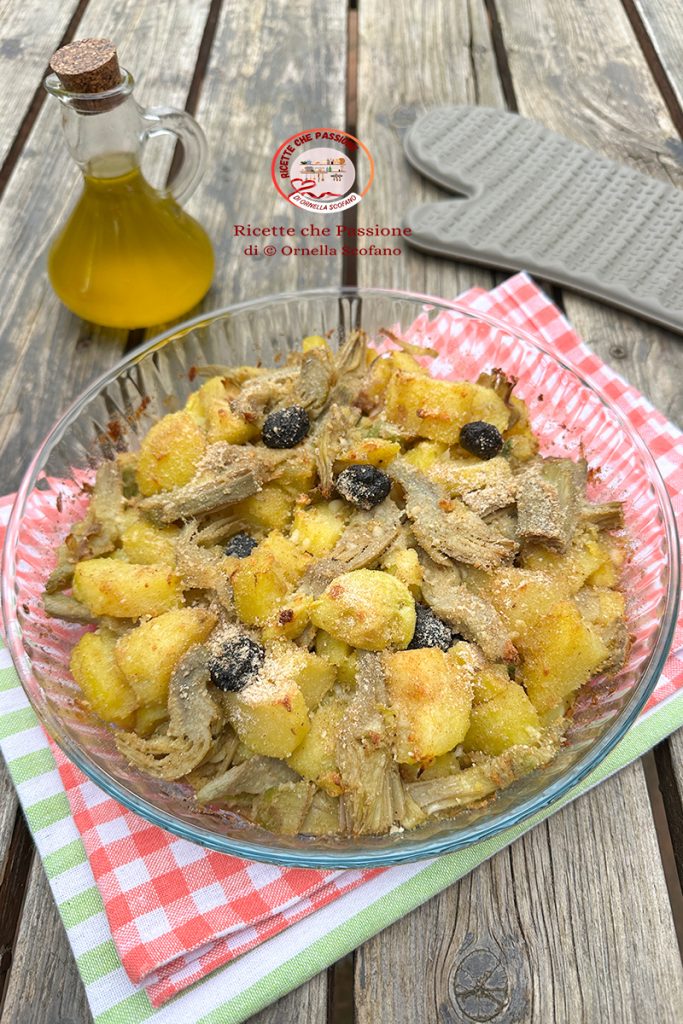 Artischocken mit im Ofen gratinierten Kartoffeln und schwarzen Oliven, ein köstliches und einfach zuzubereitendes Gericht, eine hervorragende Beilage, reichhaltig und appetitlich, perfekt auch auf dem Festtagstisch, ideal um das Ostermenü zu bereichern, um traditionelle Fleischgerichte zu begleiten. Perfekt für diejenigen, die als Hauptgericht leicht bleiben möchten, ideal für ein Mittagessen mit Kohlenhydraten und Gemüse, das man mit Eiweiß zum Abendessen ausgleichen kann, oder umgekehrt. Ich bevorzuge es aus Bequemlichkeit, die Artischocken und Kartoffeln vorher zu kochen, die Artischocken einfach zu blanchieren und die Kartoffeln im Mikrowellenofen zu garen, die so gut schmecken, aber man kann sie auch blanchieren. Für die Gratinschicht etwas geriebenen Käse mit einem Esslöffel Semmelbrösel und fertig, man kann die Aromen verwenden, die einem am besten gefallen, ich wollte etwas Oregano hinzufügen, aber da ich keine Vorräte mehr in der Küche hatte, habe ich es nicht hinzugefügt, es passt hervorragend zu Knoblauch und Petersilie, am Ende habe ich nur diese beiden verwendet, und sie waren trotzdem köstlich. Mal sehen, wie man sie zubereitet. Du findest dieses Rezept in der Sammlung Rezepte mit Artischocken.