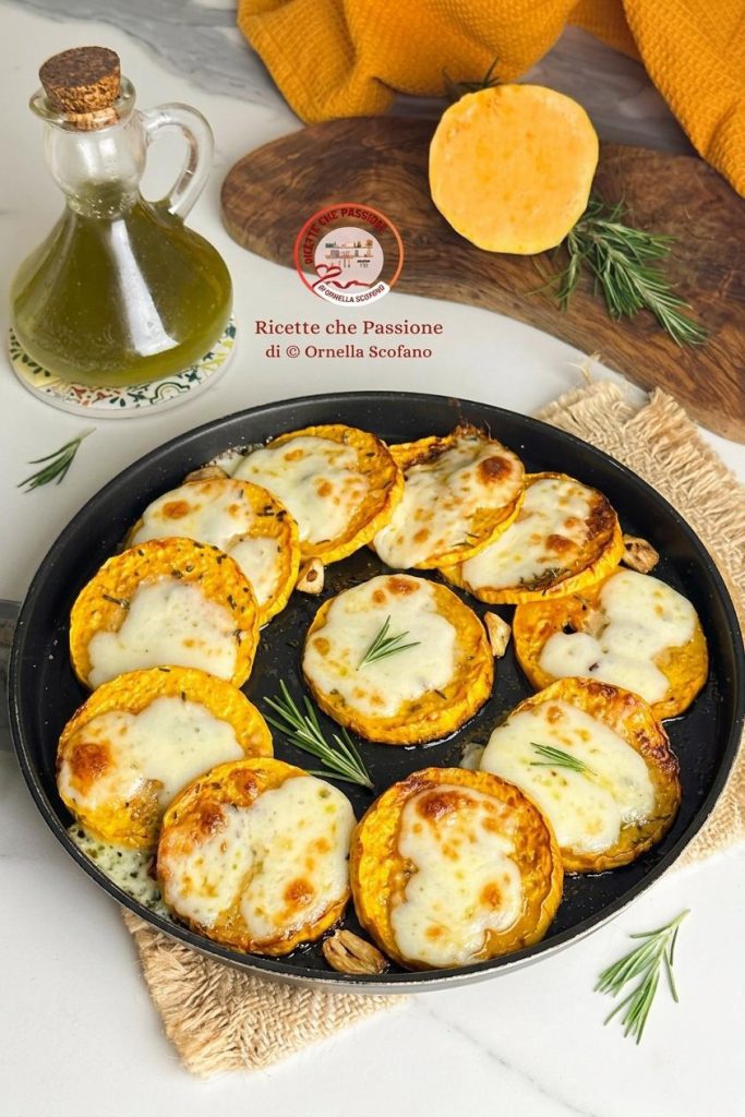 Besonders leckerer Ofenkürbis mit Käse. In wenigen Minuten ein tolles, einfaches und schnelles Gericht: Den Kürbis schälen, in Scheiben schneiden und auf das Backblech legen, mit wenigen Aromen kurz garen und am Ende den Käse hinzufügen, damit er besonders verführerisch wird. Groß und Klein lieben ihn so zubereitet – fast wie kleine Pizzen, ohne Sauce. Wenn ihr möchtet, könnt ihr etwas Tomatensauce über die gegarten Scheiben geben und dann den Käse dazugeben. Die Kinder werden denken, sie essen wunderbare Pizzetten, und ihr werdet überrascht sein, wie sehr sie den Kürbis mögen – dieses oft unbeliebte Gemüse, sowohl bei Kindern als auch bei Erwachsenen. Ich habe oft Mühe, meinen Mann davon zu überzeugen, ihn zu essen, aber ich garantiere euch: So zubereitet hat er mir sogar gesagt, dass er wirklich gut schmeckt! …