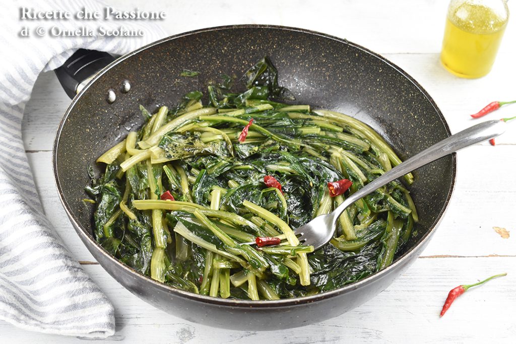 Chicorée in der Pfanne, schnelles, gesundes und nahrhaftes Rezept, vegetarisch, nur viele gute Gemüse direkt in der Pfanne zubereitet. Für dieses Rezept sind zarte Chicorée-Pflänzchen unerlässlich, nicht zu alt. Wir reinigen sie und kochen sie direkt in der Pfanne, geschmort, mit Knoblauch, Öl und Chili für eine perfekte Mischung aus Geschmack und Düften. Der Chicorée, wie Sie sicher wissen, hat einen leicht bitteren Geschmack, und wenn Sie diesen Geschmack betont mögen, ist dies das richtige Rezept für Sie, es wird köstlich, die Bitterkeit ist spürbar, aber wirklich angenehm, so sehr, dass Sie immer wieder sagen werden, bis der Teller leer ist. Schauen wir uns an, wie man sie zubereitet, und falls der Chicorée härter ist, empfehle ich, ihn vorher in kochendem Wasser zu blanchieren und später in der Pfanne mit Knoblauch und Chili zu schwenken.