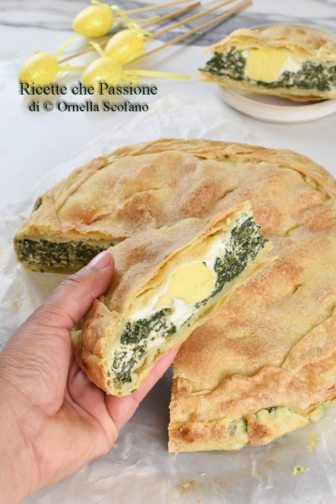 Torta Pasqualina mit Ricotta und Spinat, perfekt zu servieren unter den Ostervorspeisen oder für den legendären Osterspaziergang vorbereitet, aber ich sage Ihnen die Wahrheit, ich bereite es das ganze Jahr über zu, es ist so einfach zu machen, so leicht und schmackhaft, dass es auch als Hauptgericht sowohl zum Mittag- als auch zum Abendessen perfekt ist, oder vielleicht bequem bei der Arbeit zu genießen, weil es nicht aufgewärmt werden muss, aber wer es heiß genießen möchte, kann es natürlich tun. Für die Torta Pasqualina wird ein einfacher Teig aus Wasser und Mehl mit wenig Olivenöl, der verrückte Teig, verwendet, den Sie inzwischen alle kennengelernt haben, es ist ein einfach zuzubereitender Teig, ohne Hefe, und er ist sehr vielseitig, sowohl für süße als auch für herzhafte Gerichte, auch hervorragend für Panzerotti und gebratene oder gebackene Ravioli, Strudel und vieles mehr. Das Rezept der Torta Pasqualina stammt ursprünglich aus Ligurien, wird normalerweise mit Mangold statt mit Spinat zubereitet und hat ganze 33 Schichten; mittlerweile ist es in der ganzen Halbinsel verbreitet, und ich bereite es gerne auch mit kleinen Variationen zu. Ich habe viel weniger Schichten des verrückten Teigs gemacht, so ist es auch leichter, aber ich würde nie auf die Grundlage des Rezepts verzichten, den verrückten Teig, einen einfachen Teig mit Wasser, Mehl und Öl, wirklich schnell und so gut, mit wenig Öl wird er weich und köstlich.