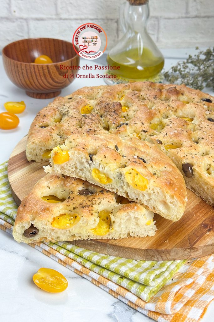Focaccia mit gelben Kirschtomaten und Oliven mit einfachem Teig
