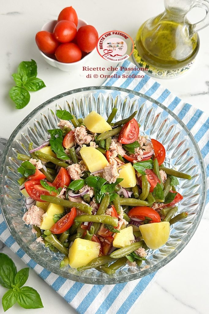 Der Kartoffel-Bohnen-Salat ist ein zeitloser Klassiker, aber im Sommer, wenn wir kalte Gerichte besonders lieben, bereichern wir ihn mit Thunfisch und ein paar anderen Zutaten, um ihn noch schmackhafter und leckerer zu machen. Eine hervorragende Mahlzeit, die man auch am Strand genießen kann. Es beginnt mit einem einfachen Kartoffel-Bohnen-Salat. Wir kochen sie zusammen, beginnend mit den Bohnen, frisch oder gefroren. Sobald das Wasser kocht, fügen wir die Kartoffeln hinzu, lassen alles abkühlen und geben die anderen Zutaten hinzu, um unseren Salat reichhaltig und köstlich zu machen. Im Sommer, wenn es sehr heiß ist, gibt es nichts Besseres, als unsere Mahlzeiten im Voraus und schnell in den kühleren Stunden des Tages zuzubereiten. Dann, wenn der kleine Hunger kommt, kann man sich gemütlich an den Tisch setzen, ohne einen Herd anzuschalten und die Umgebung weiter zu erwärmen.