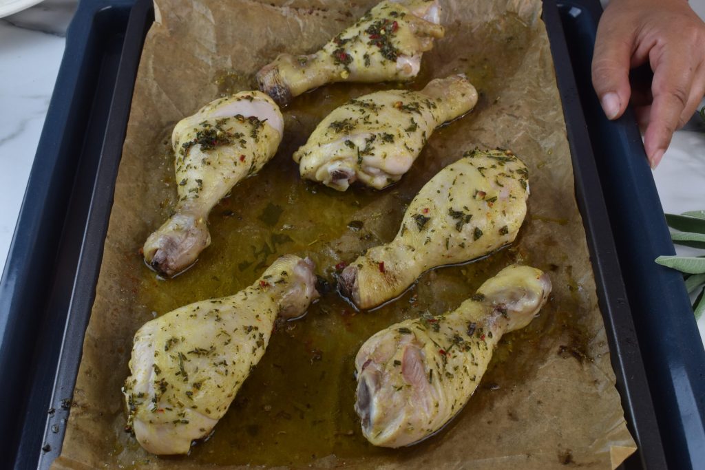 Wir arbeiten auf dem mit Backpapier ausgelegten Backblech, nehmen jeweils einen Hähnchenschenkel und bestreichen ihn gut mit der vorbereiteten Kräutermischung. Wir legen sie nach und nach auf das Backblech, lassen sie gut voneinander entfernt, und später fügen wir in den Zwischenräumen die Kartoffeln hinzu. Ungefähr die Hälfte der aromatischen Mischung sollte für die Kartoffeln übrig bleiben.