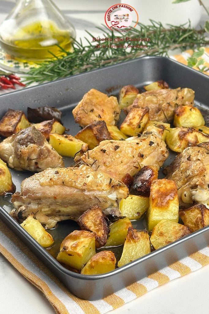 • Wir geben den Inhalt in eine antihaftbeschichtete Backform oder auf ein mit Backpapier ausgelegtes Blech. Wir backen etwa 40 Minuten in einem vorgeheizten Umluftofen bei 250°C. Nach den ersten 25 Minuten bin ich auf 220°C heruntergegangen. Wie immer nach eurem Ofen anpassen. Wir nehmen es aus dem Ofen und genießen unsere sehr zarten Hähnchenschenkel mit einem außergewöhnlichen Geschmack, meine sind leicht scharf, mit knuspriger, köstlicher Haut, ganz zu schweigen von den Kartoffeln, die zusammen mit dem Huhn ein tolles Aroma bekommen. Ein tolles Gericht zum Mittag- oder Abendessen mit der Familie, ein Klassiker für den Sonntag, aber nicht nur.