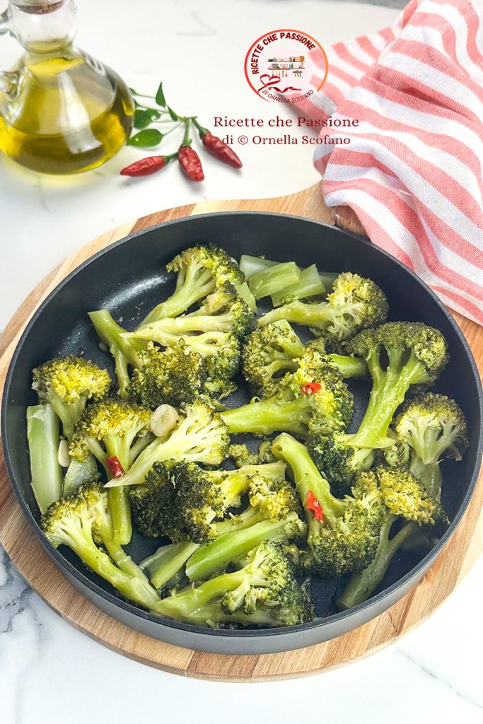 In die Pfanne etwas Olivenöl geben, in Scheiben geschnittenen Knoblauch und zerkleinerte Peperoni hinzufügen, kurz erhitzen, dann die Brokkoli hinzufügen, ein knappes Glas Wasser hinzufügen, salzen, abdecken und bei niedriger Hitze etwa 15 Minuten kochen lassen.