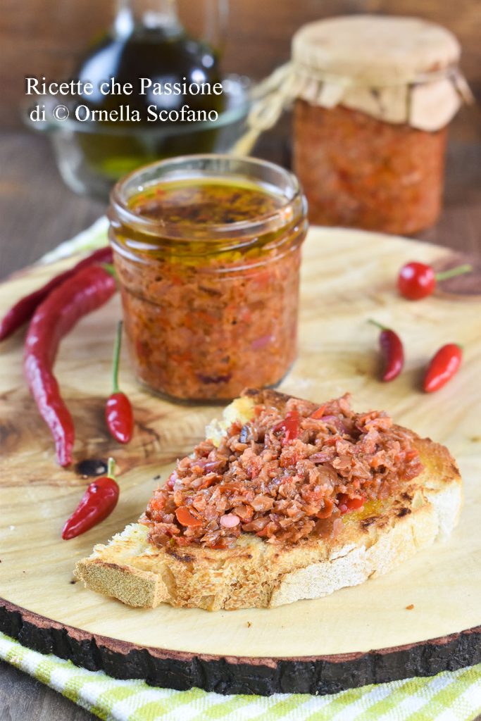Kalabrische Bomba oder Piccantino, eine scharfe Creme, die auf einer Bruschetta genossen werden kann, aber auch hervorragend geeignet ist, um unsere Gerichte in der Küche zu würzen. Die kalabrische Bomba ist eine Zubereitung mit scharfem Chili und gemischtem Gemüse. Normalerweise werden Auberginen, Paprika und manchmal auch eine Karotte und eine Selleriestange verwendet, die ich nicht benutzt habe und durch eine schöne rote Zwiebel aus Tropea ersetzt habe. Man kann die kalabrische Bomba tatsächlich mit dem eigenen Lieblingsgemüse würzen, man kann auch getrocknete Tomaten oder Steinpilze hinzufügen, am besten die getrockneten, um sie leicht in die Zubereitung einzubinden, nachdem sie wie das restliche Gemüse in Essig eingelegt wurden, oder man kann bereits in Öl eingelegte verwenden, hier die Pilze in Öl. Wir können die Menge des Chilis variieren, um die kalabrische Bomba oder Piccantino mehr oder weniger scharf zu machen. Oft wird dieser Zubereitung auch Anchovis hinzugefügt, ich habe sie aber nicht verwendet, um eine vegane Bomba zuzubereiten. Wer möchte, kann sie nach dem Entfernen der Gräten hinzufügen und zusammen mit dem Gemüse pürieren. 150 g reichen aus. Also lasse ich euch das Rezept für die kalabrische Bomba oder Piccantino, eine Konserve, die lange haltbar in der Speisekammer aufbewahrt werden kann, immer bereit, um im Handumdrehen köstliche Bruschettas und mehr zu zaubern, da sie sich hervorragend zum Aufpeppen jeder Art von Gericht eignet, sei es Fleisch, Fisch, Pasta und vieles mehr.
