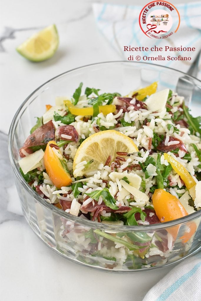 • Wir beginnen, dem kalten Reis den Saft einer Viertel Zitrone hinzuzufügen. Wir mischen und geben alle anderen Zutaten hinzu: Rucola, Grana, Bresaola, Tomaten und Paprika, wir rühren gut um, probieren und passen nach Belieben an, ob wir noch mehr Zitronensaft hinzufügen wollen. Dies kann je nach Zitrone variieren. Ich habe insgesamt den Saft einer halben Zitrone verwendet und fand es perfekt so.
