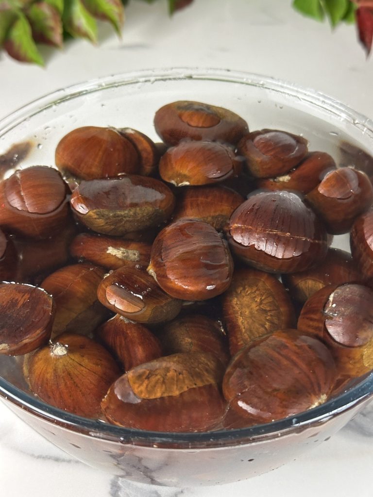 Zweiter sehr nützlicher Schritt, wir legen die Kastanien in einer Schüssel in kaltes Wasser. Mindestens eine halbe Stunde einweichen lassen.