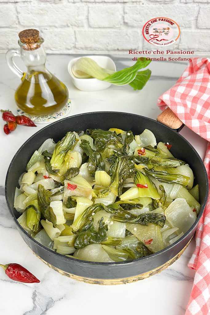 Pak Choi chinesischer Kohl in der Pfanne mit Knoblauch, Öl und Chili, ein italienisches Rezept für ein etwas ungewöhnliches Gemüse, das man nicht immer findet, aber im Herbst auch in Italien angebaut wird. Wenn ich es finde, nehme ich es immer mit nach Hause, es ist köstlich, kocht schnell, da es sehr zart ist, aber auch der Geschmack ist eine Köstlichkeit, es ist nicht bitter, sondern süßlich, was es noch mehr geschätzt macht. Direkt in der Pfanne gekocht, ohne es vorher zu blanchieren, ist es eine wirklich köstliche Beilage, auch hervorragend zum Füllen einer rustikalen Pizza. Es kann in tausend Varianten zubereitet werden, aber heute wollte ich es einfach in der Pfanne zubereiten, wie wir es hier im Süden mit vielen einheimischen Gemüsesorten machen. Probiert es aus, es ist köstlich.