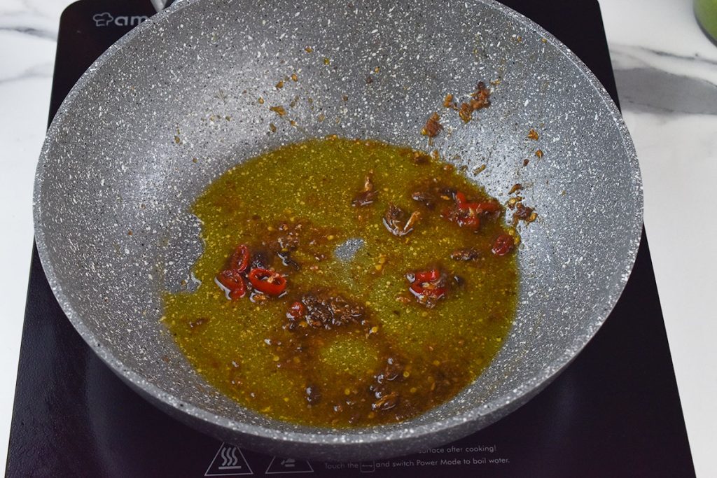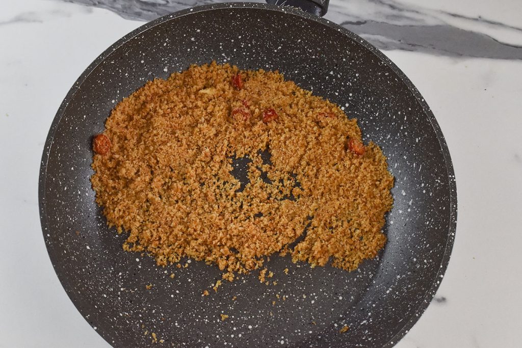 • 6. In einer kleinen Pfanne mit etwas Olivenöl, Knoblauch und Chili rösten wir etwas Semmelbrösel und stellen sie beiseite.