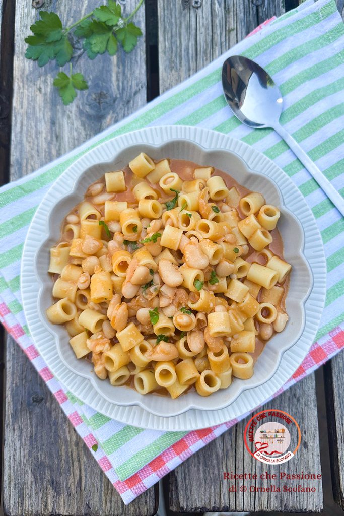 Schritte zur Zubereitung von schneller Pasta mit Bohnen in der Pfanne mit Ditalini und gekochten Cannellini-Bohnen