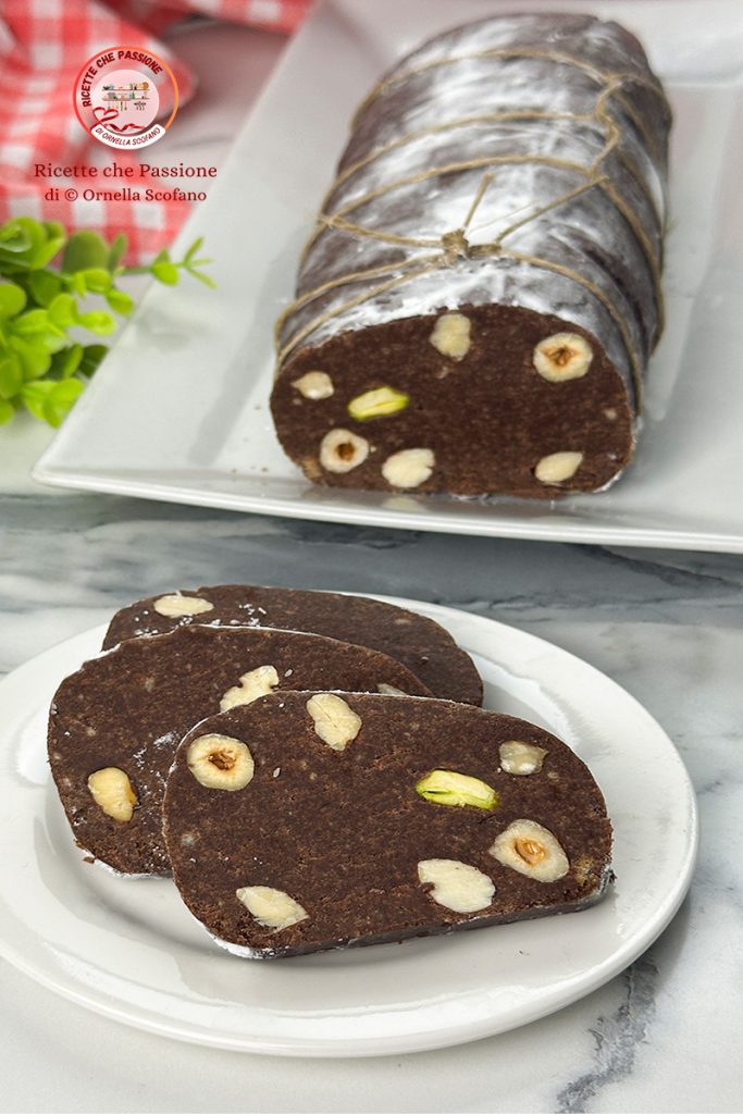 Schokoladensalami ohne Butter zubereitet mit Kondensmilch und Trockenfrüchten, aromatisiert mit Zimt und Amaretto, einfach zu machen und geht buchstäblich weg wie warme Semmeln, denn es hat einen Nachteil, es macht süchtig. Die Schokoladensalami mit Kondensmilch zuzubereiten ist kinderleicht und erfordert nur wenige Zutaten: zermahlene Kekse, die zusammen mit geschmolzener Schokolade, Kondensmilch und Likör, in meinem Fall Amaretto, verarbeitet werden. Ich habe einen guten Amaretto-Geschmack hinzugefügt, aber ein anderer Likör wie Rum oder Orangenlikör wäre auch in Ordnung. Ich habe auch reichlich Kakao und Zimt hinzugefügt, um ihm einen intensiveren Geschmack zu verleihen, und ich muss sagen, die Wahl war goldrichtig. Rückblickend hätte ich noch etwas kandierte Orangenschalen hinzufügen können, die ich zu Hause zubereite und die köstlich sind, sie wären hervorragend gewesen, schade, dass ich nicht vorher daran gedacht habe.
