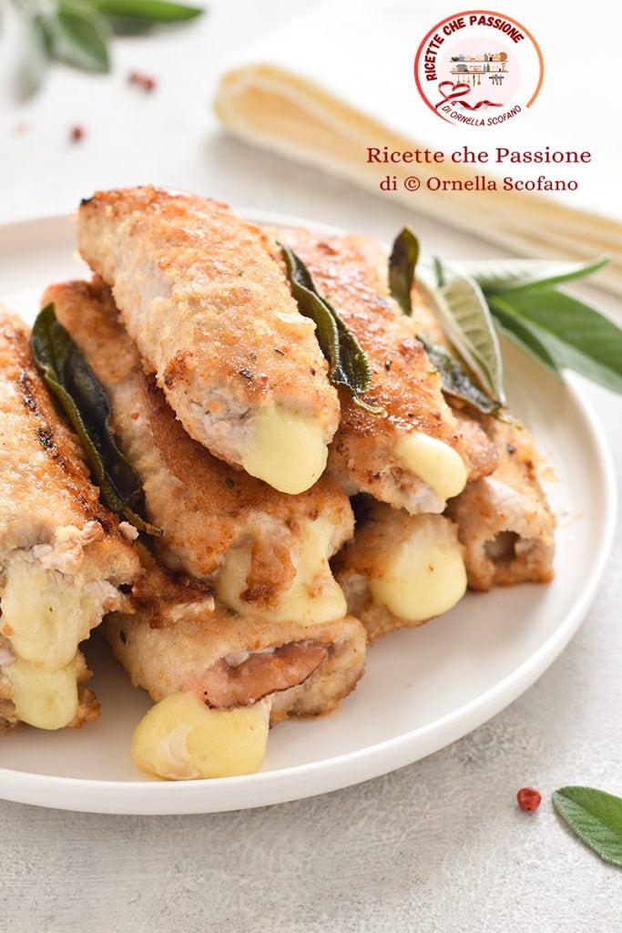 Zum Kochen habe ich in der Pfanne ein Stück Butter mit einem Zweig Salbei gegeben. Ich habe es ein wenig erhitzt und die Rouladen hinzugefügt, die ich auf einer Seite goldbraun werden ließ und dann wendete, auch auf der anderen Seite goldbraun werden ließ, bevor ich mit etwas Weißwein ablöschte. Ich habe den Deckel aufgesetzt und die Rouladen eine Minute so in der Pfanne gelassen, dann den Deckel abgenommen und bei starker Hitze gut trocknen lassen. In wenigen Minuten habe ich so meine gefüllten Schweinerouladen mit schmelzendem Provola auf den Tisch gebracht.