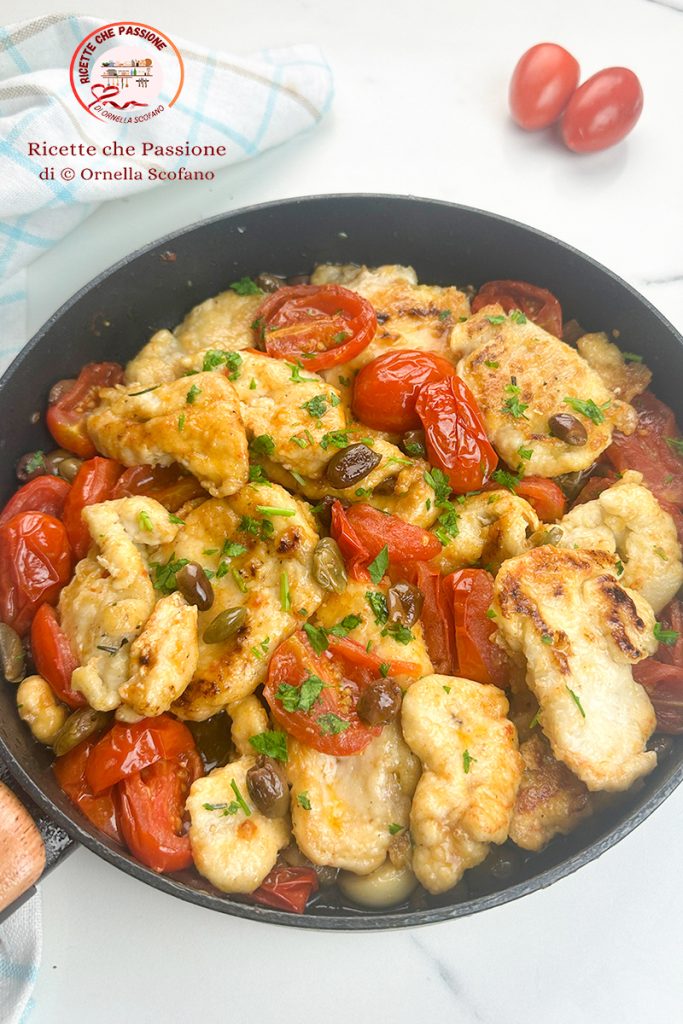 Superzartes Hähnchen auf mediterrane Art mit Kirschtomaten, Oliven und Kapern, ein perfektes Gericht zum Tunken. Und zu denken, dass ich früher keine mit Tomaten gekochten Sachen mochte, aber jetzt benutze ich viel Kirschtomaten oder Picadilly und liebe sie, um schnelle und köstliche Gerichte zuzubereiten, und dieses Hähnchen ist es wirklich. Es ist blitzschnell zubereitet: Ich bereite zuerst einfache Hähnchenschnitzel in Weißwein zu, stelle sie dann beiseite und brate die Kirschtomaten mit den Oliven und Kapern an. Da ich keine eingemachten Oliven mehr hatte, habe ich Taggiasca-Oliven als Ersatz genommen, da der Supermarkt in meiner Nähe alles hat außer kalabresischen Oliven. So habe ich dieses superzarte Hähnchen für das Sonntagsessen mit der Familie zubereitet, das allen, auch den Kindern, sehr gut gefallen hat, genauso wie der im Ofen gebackene Kürbis, den ich als Beilage zubereitet hatte.