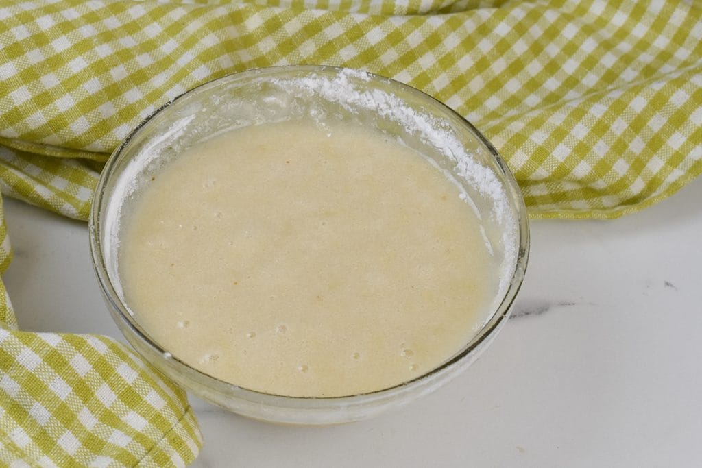 Wir beginnen mit der Zubereitung des Lievitino. In einer Schüssel lösen wir die Hefe in der lauwarmen Milch. Wir rühren mit einem Löffel und fügen das Mehl hinzu, gut vermischen, um eine weiche und klebrige Masse zu erhalten. Gut arbeiten, um sie klumpenfrei und elastisch zu machen, in ein paar Minuten ist es fertig. Abdecken und zum Aufgehen stellen. Gut aufgehen lassen, bis es sich verdoppelt hat, oder Sie werden sehen, dass sich auf der Oberfläche Bläschen bilden. Die Zeiten variieren je nach Raumtemperatur, die von 28°C bis 15°C variieren kann, je wärmer, desto kürzer die Zeit, ich empfehle auch hier einen Mittelweg.