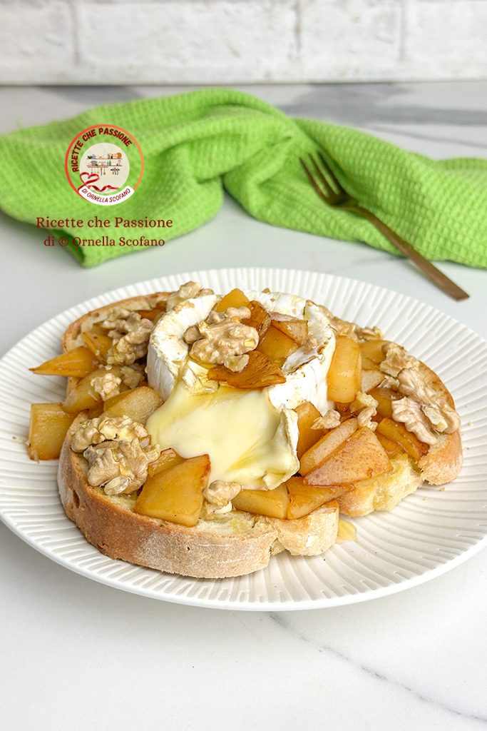Überbackener Brie mit Birnen, Honig und Walnüssen – die schicke Vorspeise oder das schnelle, leckere Abendessen für zwei gemütliche Menschen wie mein Mann und ich, wenn wir uns einfach etwas Ruhe gönnen und ohne großen Aufwand etwas Köstliches genießen wollen. Gleichzeitig ist es perfekt, wenn wir einen Aperitif oder eine elegante Vorspeise für unsere Freunde vorbereiten möchten: In wenigen Minuten ist alles vorbereitet, man arbeitet nur ein wenig im Voraus, so dass man den Ofen nur noch einschalten muss und alles ist fertig. Es ist sehr wichtig, den Käse heiß und cremig zu servieren, damit man ihn löffelweise auf die Crostini streichen kann, zusammen mit den in der Pfanne karamellisierten Birnen, begleitet von Blütenhonig oder Kastanienhonig, wenn ihr das lieber mögt, und leicht im Ofen gerösteten Walnüssen. Also: Sekt kaltstellen und dieses köstliche Rezept genießen – es passt fantastisch dazu.