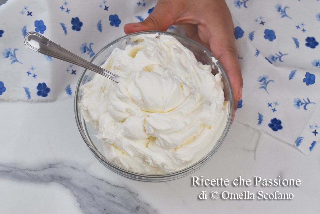 • Schlagen wir die Sahne mit den elektrischen Schneebesen, 250 g oder etwas weniger, um genügend für die nächsten Phasen zu haben, fügen wir den Mascarpone hinzu und mischen gut, schließlich regulieren wir den Zucker, ich habe 50 g Puderzucker hinzugefügt, mit bereits gesüßter Schlagsahne. Mischen wir gut und lassen es beiseite im Kühlschrank.