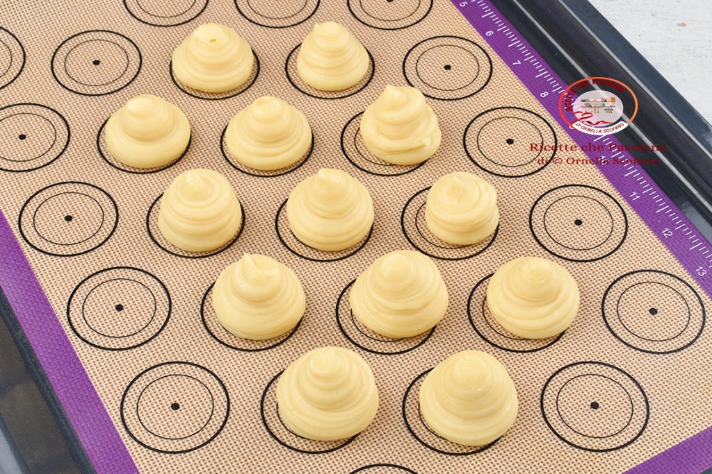 Wir backen ein Blech nach dem anderen im statischen Ofen bei 220°C für die ersten 15-20 Minuten. Wenn wir bemerken, dass unser Brandteig bereits goldbraun ist, senken wir die Temperatur auf 200°C für weitere 10-15 Minuten. Dann senken wir den Ofen auf 180-160°C, immer abhängig von unserem Ofen, und lassen sie weitere 10 Minuten mit geöffneter Ofentür trocknen. Es ist sehr wichtig, dass sie gut trocknen, damit sie nach dem Herausnehmen aus dem Ofen nicht zusammenfallen, sondern knusprig und fest bleiben.