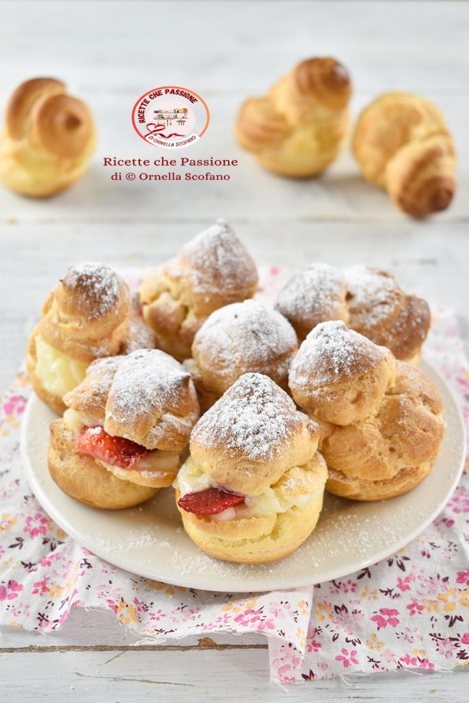 Leckere Windbeutel mit der leckersten Vanillecreme, ergänzt durch Erdbeeren oder andere frische Früchte. Ich hatte vor einiger Zeit diese köstlichen Windbeutel gemacht, hatte vergessen, euch das Rezept zu geben, und nutze die Gelegenheit heute, wo es etwas kühler ist und man im Dachgeschoss ein wenig arbeiten kann, mit der Hitze ist es nie ideal, aber man kann sich trösten, wenn man dieses wunderbare Tablett mit fertigen Windbeuteln sieht, gefüllt mit einer köstlichen Vanillecreme und frischen Erdbeeren. Für die Windbeutel habe ich das übliche Rezept für den Brandteig verwendet, das ich schon lange benutze. Wenn ihr möchtet, könnt ihr, da es mindestens 40 Windbeutel ergibt, die Menge halbieren, oder ihr macht es wie ich, ein Teil wird für die Windbeutel verwendet und der andere Teil für die Zubereitung von Krapfen oder anderen Süßigkeiten. Für die reichliche Füllung mit Vanillecreme, ist die schnelle und verschwenderische Vanille perfekt.