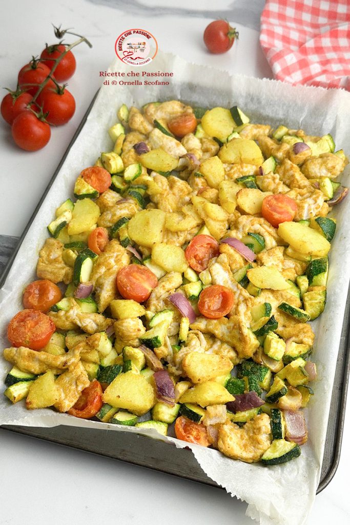 Würzige Hähnchenstreifen im Ofen gratiniert mit Gemüse, für ein ausgewogenes, gesundes und leichtes Gericht, geeignet auch für Diätende und vor allem sehr schnell, perfekt auch für Eilige, mit Hähnchen, das durch die schnelle Zubereitung zart und saftig bleibt. Heute nach dem Fitnessstudio hatte ich Lust auf etwas Leckeres, aber Schnelles und auch Leichtes, also dachte ich daran, Hähnchenbrust mit Gewürzen, Curry, Tandoori und Masala zuzubereiten, angereichert mit Gemüse, um ein komplettes und ausgewogenes Gericht zuzubereiten. Ich habe Zucchini und Kirschtomaten hinzugefügt, und um auch meinen Mann glücklich zu machen, habe ich eine Kartoffel hinzugefügt, die ich 3 Minuten in der Mikrowelle erhitzt habe, um in wenigen Minuten eine gleichmäßige Garung zu erreichen. Also, wie wäre es, es sofort auszuprobieren? Hervorragend sowohl zum Mittag- als auch zum Abendessen und es muss nichts weiter hinzugefügt werden.
