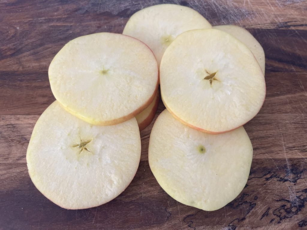 • Schneide die Äpfel gleichmäßig mit einer Mandoline, in einer Dicke von etwa zwei Millimetern.