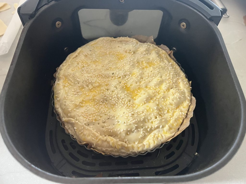 • In der Zwischenzeit bereite den Blätterteig vor, für das Rezept klicke HIER oder, wenn du keine Zeit hast, kannst du ihn bereits fertig kaufen. Rolle ihn auf einem runden Blech für Heißluftfritteuse d. 20 aus, das mit Backpapier, ausgelegt oder leicht eingefettet ist, und steche den Boden mit den Zinken einer Gabel ein