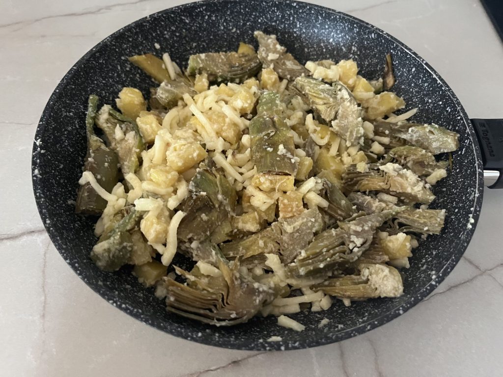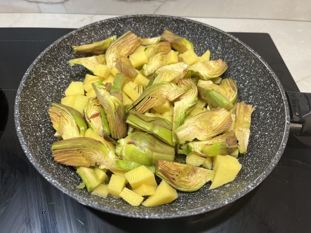 • Erhitze in einer großen Pfanne einen Schuss extra natives Olivenöl und brate die Kartoffeln bei mittlerer Hitze an, wobei du häufig umrührst. Nach ein paar Minuten, etwa 3-4, füge die gut gespülten und abgetropften Artischocken hinzu, würze mit Salz