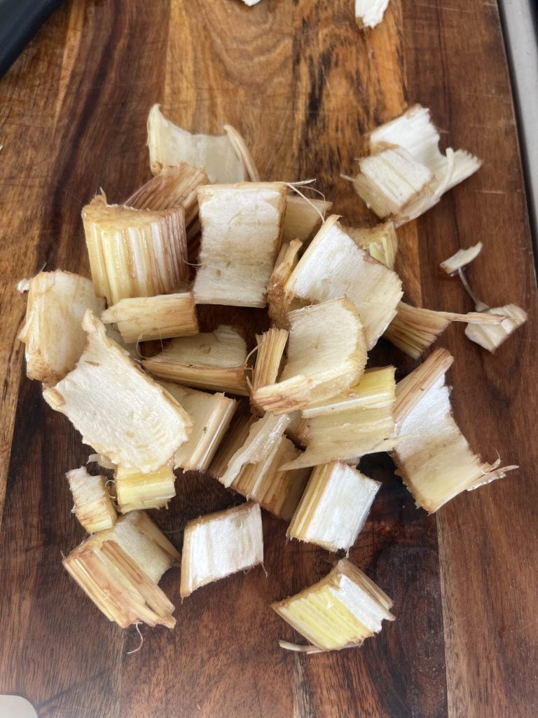 • Dann schneiden wir auf einem Schneidebrett den Cardy in mittlere Stücke. Inzwischen bringen wir einen Topf mit reichlich Wasser zum Kochen, in dem wir den Cardy etwa 10 Minuten kochen werden.