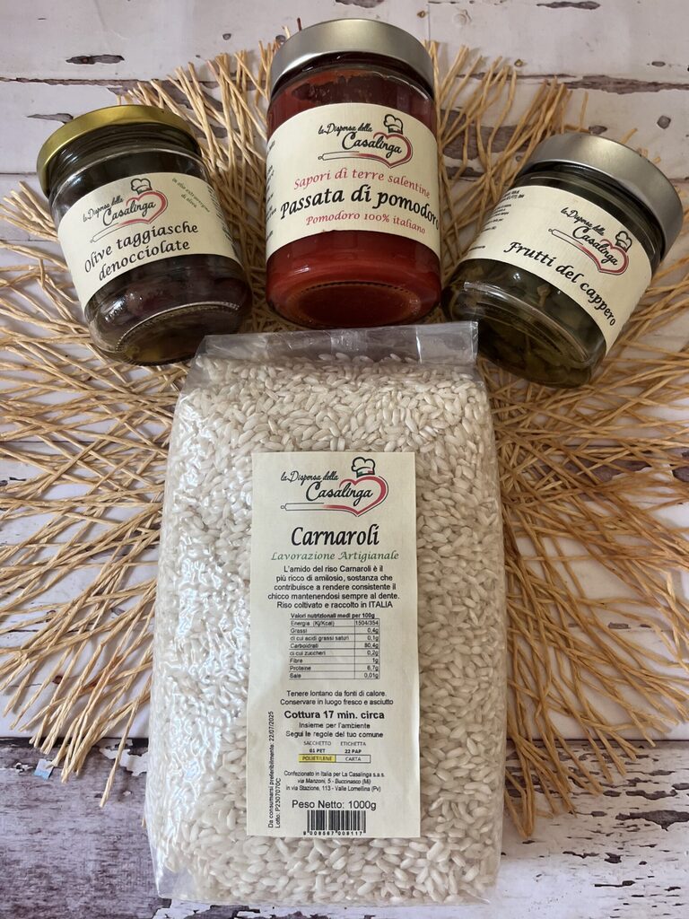 Die Friggitelli werden ausgehöhlt und mit einer reichen und schmackhaften Füllung auf Basis von Carnaroli-Reis handwerklicher Verarbeitung gefüllt, der in Italien angebaut und geerntet und al dente gekocht wird, entkernte Taggiasca-Oliven, direkt aus Taggia stammend, in begrenzten Mengen produziert, um beste Qualität zu gewährleisten, in bestem Olivenöl extra vergine eingelegt, in Scheiben geschnitten und kapern zerkleinert, die ebenfalls handwerklich hergestellt werden.