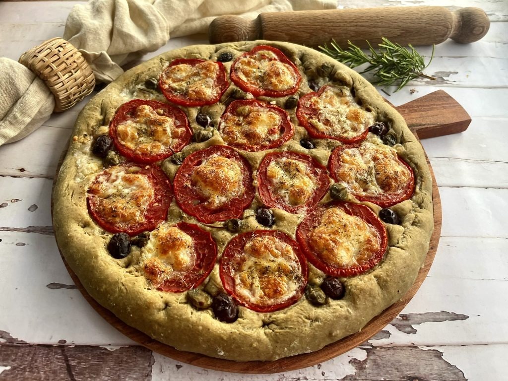 Die Focaccia alla Caprese mit Hanfmehl ist eine besondere Focaccia, beginnend mit ihrer grünlichen Farbe und ihrem Hanf-Nachgeschmack.